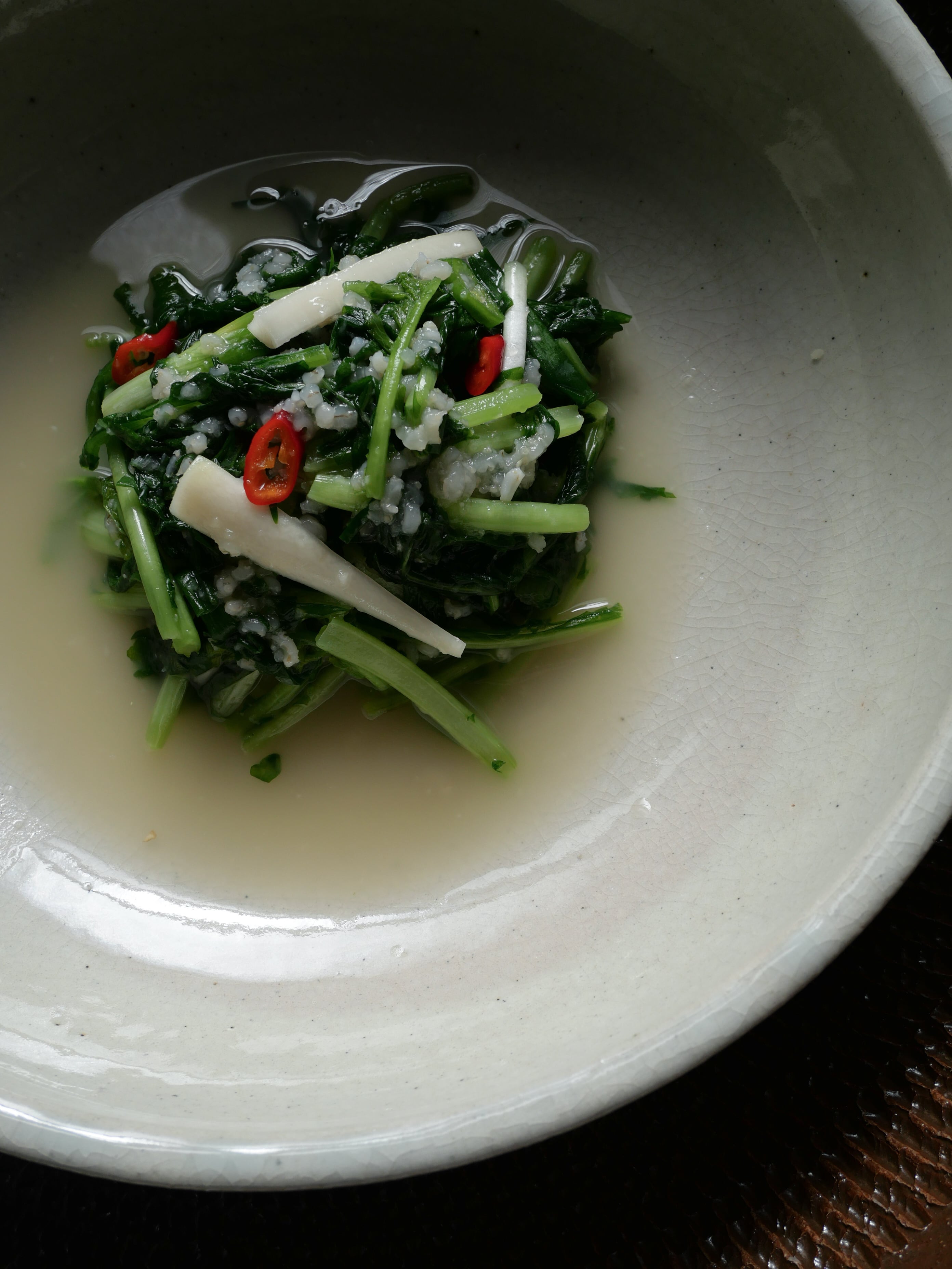 発酵した麦の軽やかな香りは、葉大根と唐辛子の青い香り、